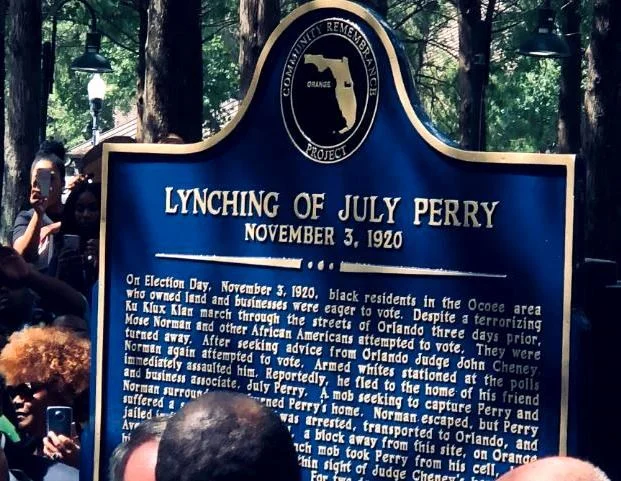 The Truth and Justice Center of Orange County unveiled a historical marker in downtown Orlando in June 2019 in memory of July Perry, a victim of the 1920 Ocoee Election Day Riots. Credit: Orlando Police Department.