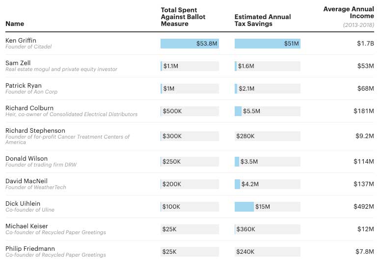 Opponents of the graduated income tax formed at least five different campaign committees that raised nearly $63 million altogether. The best funded, by far, was the Coalition to Stop the Proposed Tax Hike Amendment, which collected almost $60 million, including the $54 million from Griffin. The coalition received most of its remaining money from other billionaires and millionaires, according to state campaign donation records.